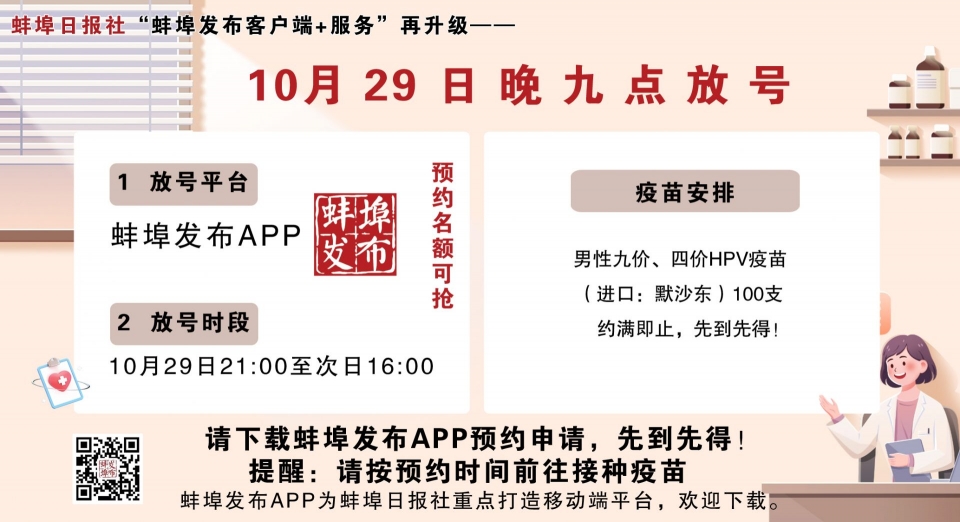 10月31日晚九點!蚌埠發布APP疫苗預約準時開放→